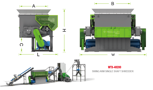 plastic sheet plastic film and bag II. TECHNICAL FEATURES a It has efficient tearing ability, provides high shear force and ensures high crushing yield b High speed swing arm pushing system to maximize output c Install the shock absorber so that it tears smoothly d Hard tooth surface reducer is adopted, which is safe and stable, equipped with water cooling function e Independent control electric box, Siemens PLC control f The whole system meets the CE safety standard III. TECHNICAL PARAMETERS WTX48 Series Swing Arm Single Shaft Shredder: