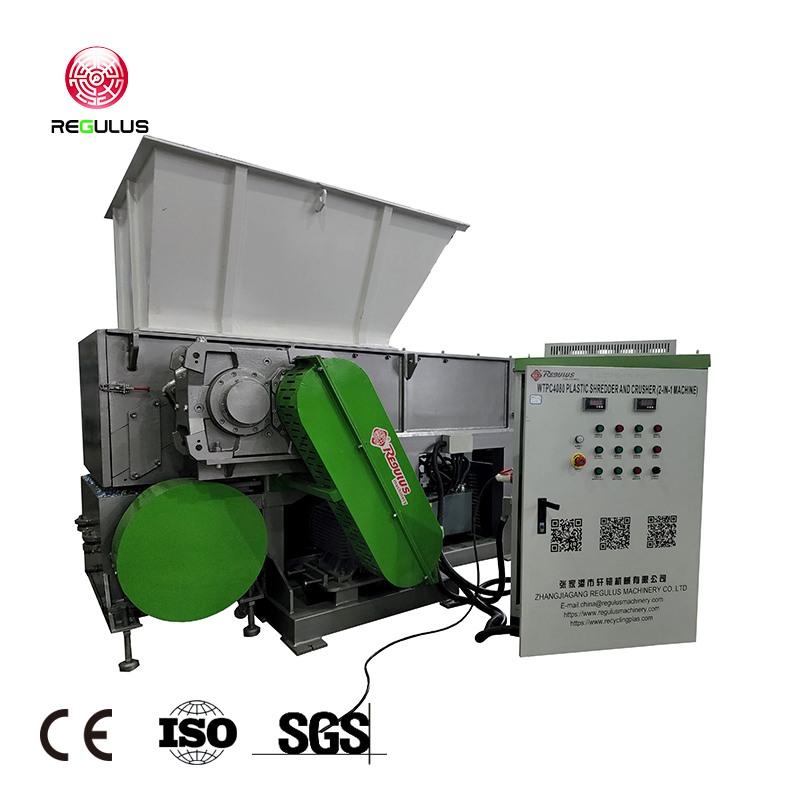 Design of Plastic Shredder andGranulator 2 in 1 machine a. Single shaft shredder and granulator are built together. b. Waste plastic shredder and crusher in one machine has two parts in one machine. The first part is shredding part on the top. The second part is crushing parts, which is under the shredding part for fine crushing. c. End product is 8-16mm particle materials. d. After shredding, the shredding material goes into crusher machine directly. Through this shrdedding crushing 2-in-1 machine, customer no need to buy belt conveyer between shredder and granulator, so it can save cost and save space.